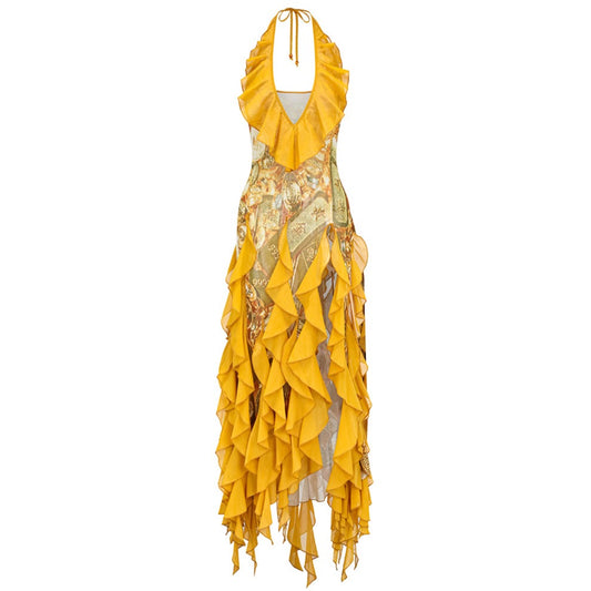 Gold Print Frill Dress